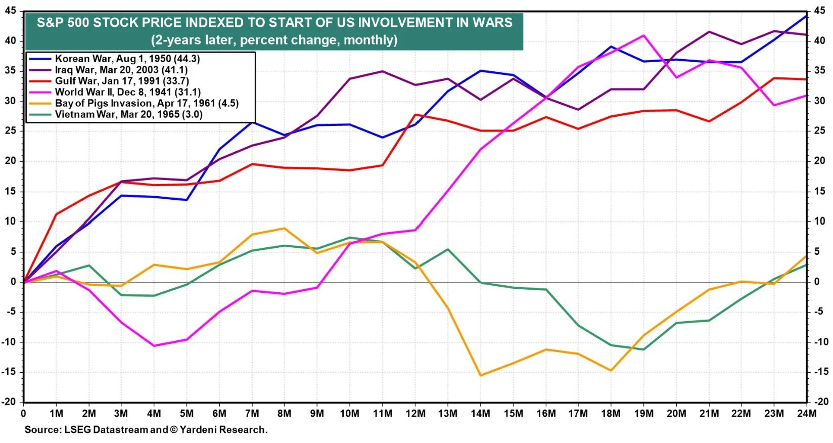 When looking specifically at periods of conflict, history offers a similar perspective. The chart below shows that the S&P 500 has been higher two years after the start of the past six major US military engagements.(1*)
